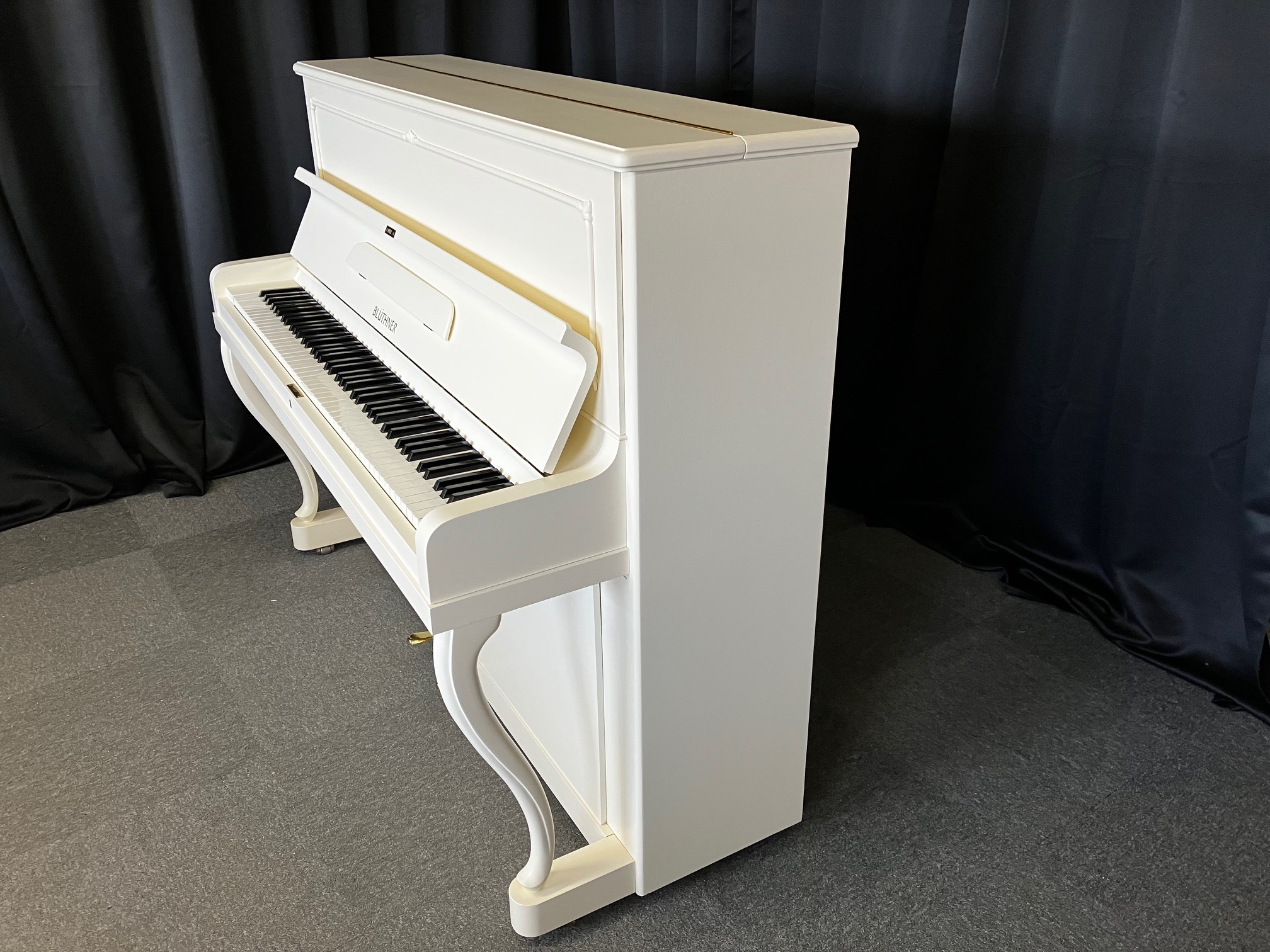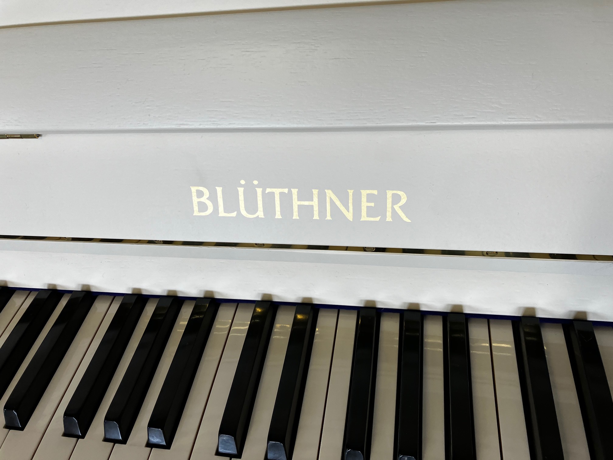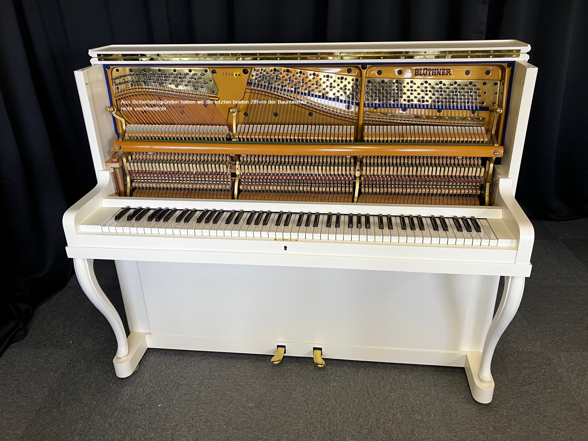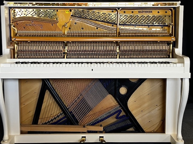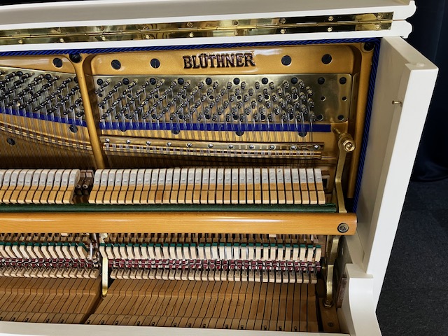 Nach unseren Überholungsarbeiten beeindruckt nun das Blüthner Klavier Modell 120 in weiß wieder optisch und technisch mit seinem hervorragenden Zustand und seiner eleganten Erscheinung.