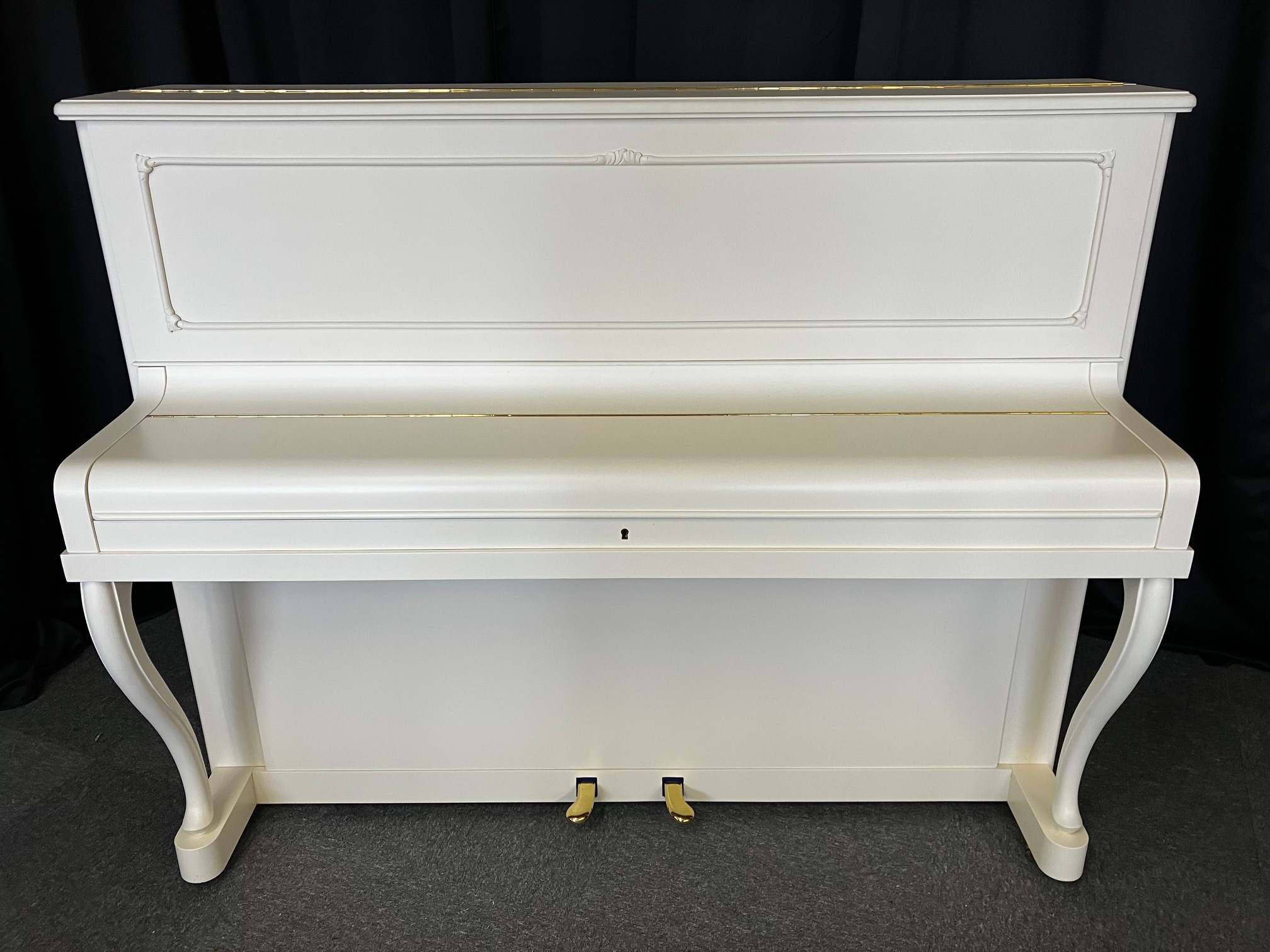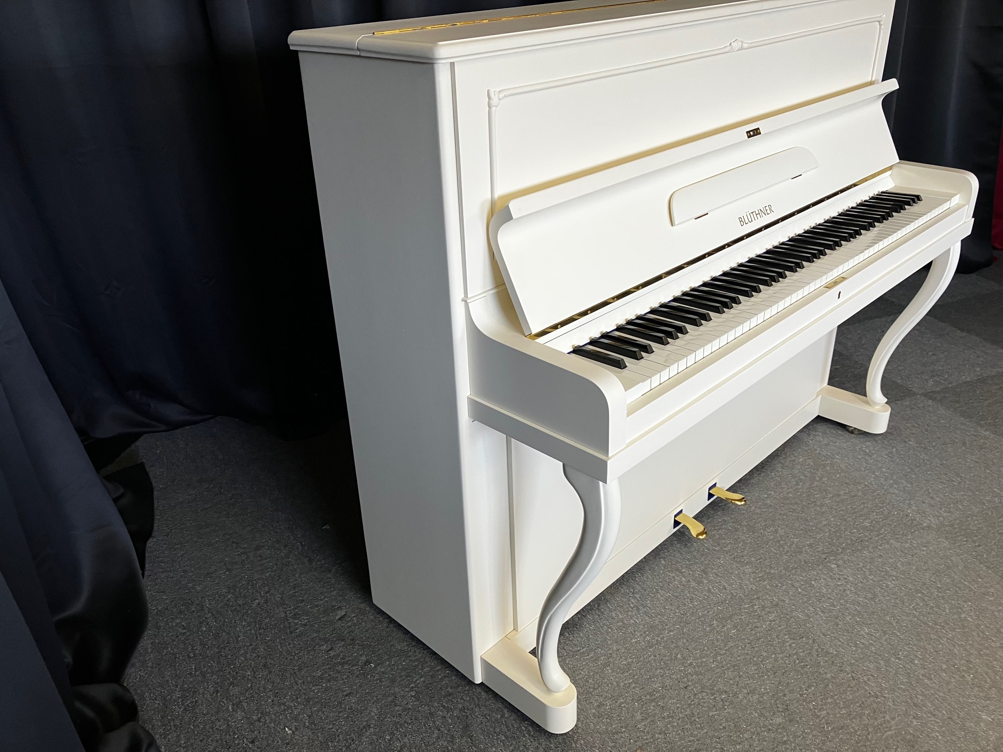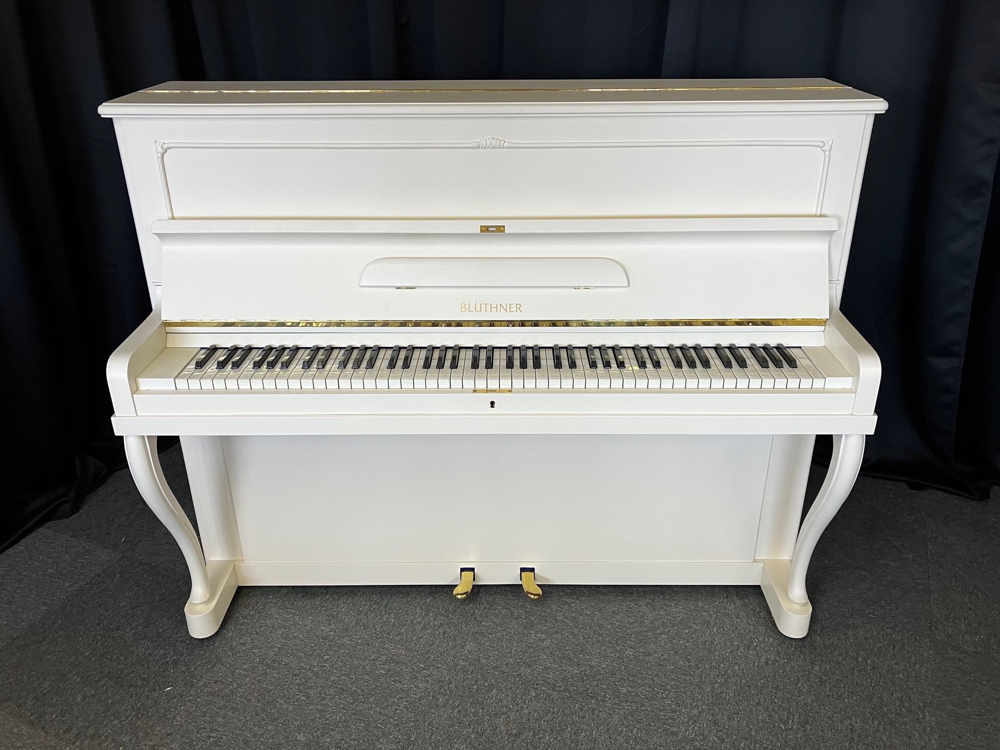 Nach unseren Überholungsarbeiten beeindruckt nun das Blüthner Klavier Modell 120 in weiß wieder optisch und technisch mit seinem hervorragenden Zustand und seiner eleganten Erscheinung.