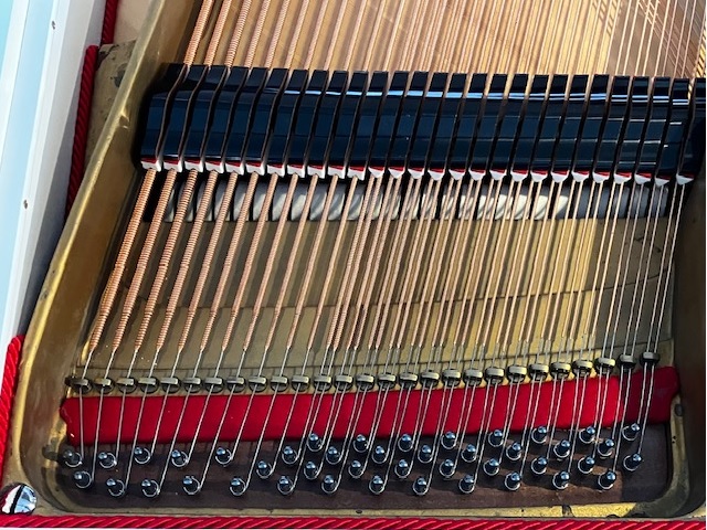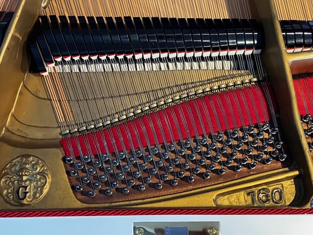 Der Saitenbezug wurde komplett erneuert. Sowohl die Stahlsaiten als auch die Basssaiten wurden durch maßangefertigte Qualitätssaiten ersetzt. Die Saitenauflagefilze wurden komplett erneuert. Der Resonanzboden wurde fachmännisch ausgespant und anschließend abgeschliffen und mit Resonanzbodenlack neu lackiert.